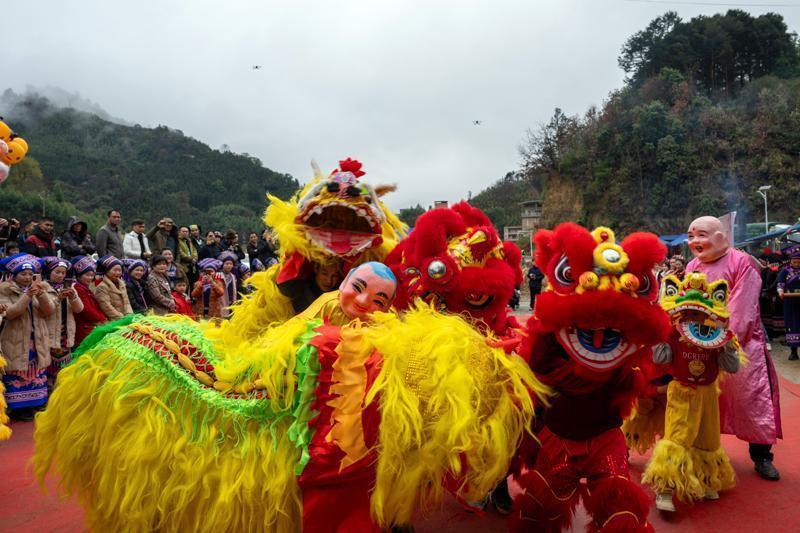 当日清晨,弄光村的村口已是人头攒动,彩旗飘扬。村民们身着绚丽多彩的节日盛装,鲜艳的服饰在阳光照耀下光彩夺目。现场锣鼓喧天,舞狮表演活力四射,以最热情的方式迎接来自各地的宾客。