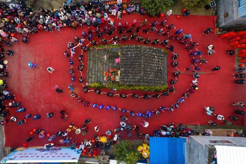 在瑶娘亭前,一场庄重而神圣的祭祀仪式正在举行。村民们手牵手,跳起祈福舞,随后手持香火,虔诚地祭拜瑶娘,祈求风调雨顺、五谷丰登。
