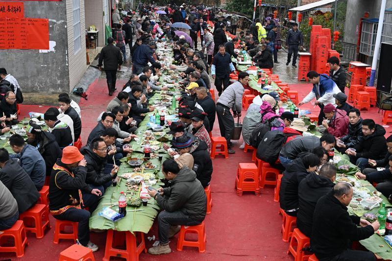 祭祀结束后,村里摆起了百米长的民族融合长桌宴。壮瑶同胞与游客们围坐在一起,共同品尝芭蕉叶上的糯米饭、土猪肉等特色美食。席间,村民们以悠扬的山歌互敬美酒,欢声笑语回荡在整个村庄。